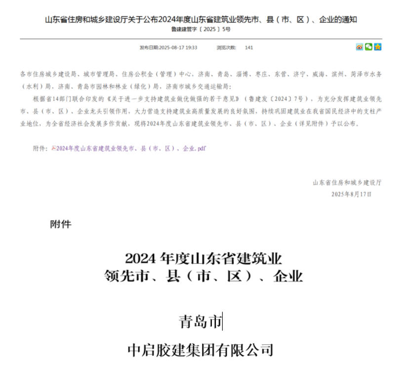 近日,山東省住房和城鄉(xiāng)建設(shè)廳正式公布2024年度山東省建筑業(yè)領(lǐng)先市、縣(市、區(qū))、企業(yè)名單,中啟膠建集團有限公司憑借卓越的綜合實力、穩(wěn)健的經(jīng)營表現(xiàn)和突出的行業(yè)貢獻,成功入選“2024年度山東省建筑業(yè)綜合實力領(lǐng)先企業(yè)”。這是繼獲評“齊魯建造”品牌后,公司本年度再度斬獲的省級重磅榮譽,標志著企業(yè)在高質(zhì)量發(fā)展征程中邁上新臺階!