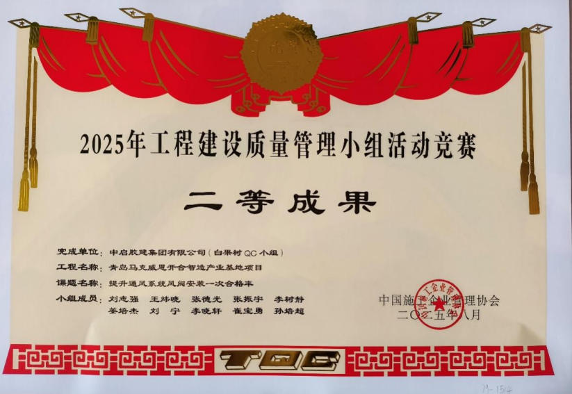 中啟膠建集團青島公司發(fā)布的QC成果“提升通風(fēng)系統(tǒng)風(fēng)閥安裝一次合格率”榮獲中施企協(xié)2025年工程建設(shè)質(zhì)量管理小組活動競賽二等成果。